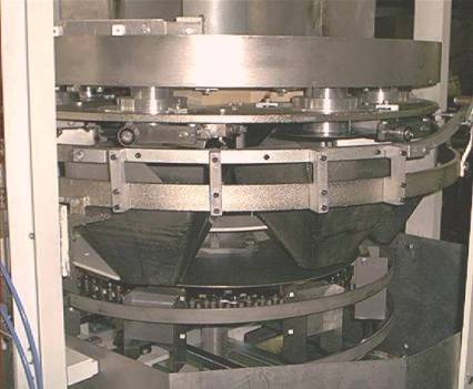 Product Transition Spouts Accepting Product Discharge from Scale into carton. Continuous Motion Application.
